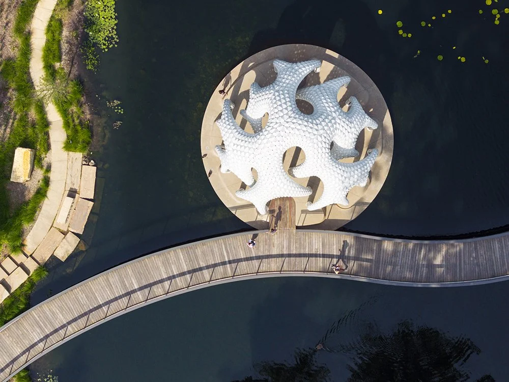Unlike many classical precedents, Marc Fornes reimagines the folly as something more dynamic and nonlinear. The canopy unfolds as a branching, cocoon-like structure—a sum of slender legs and curving elements that gather overhead. It creates a sense of enclosure without heaviness, like stepping into a protective shell suspended above the island.