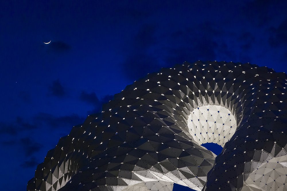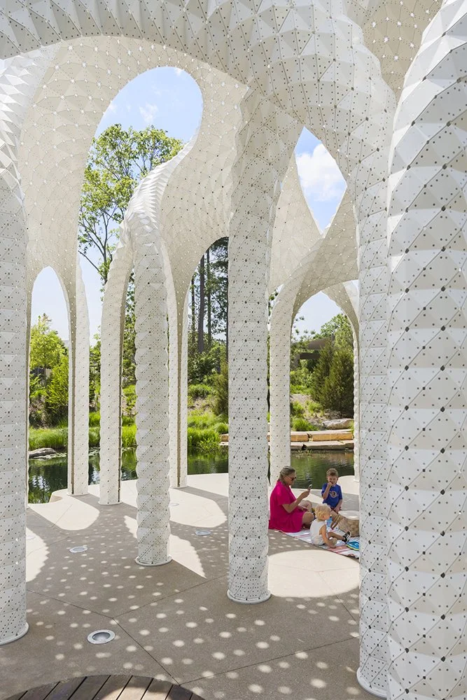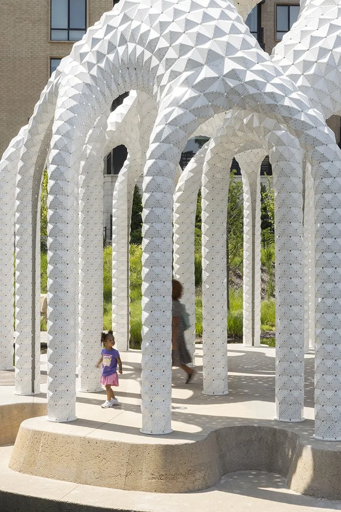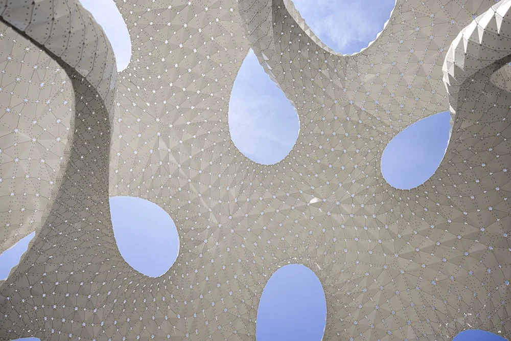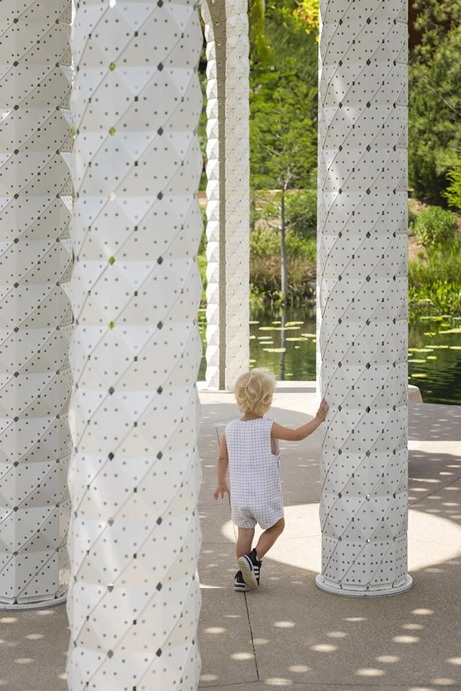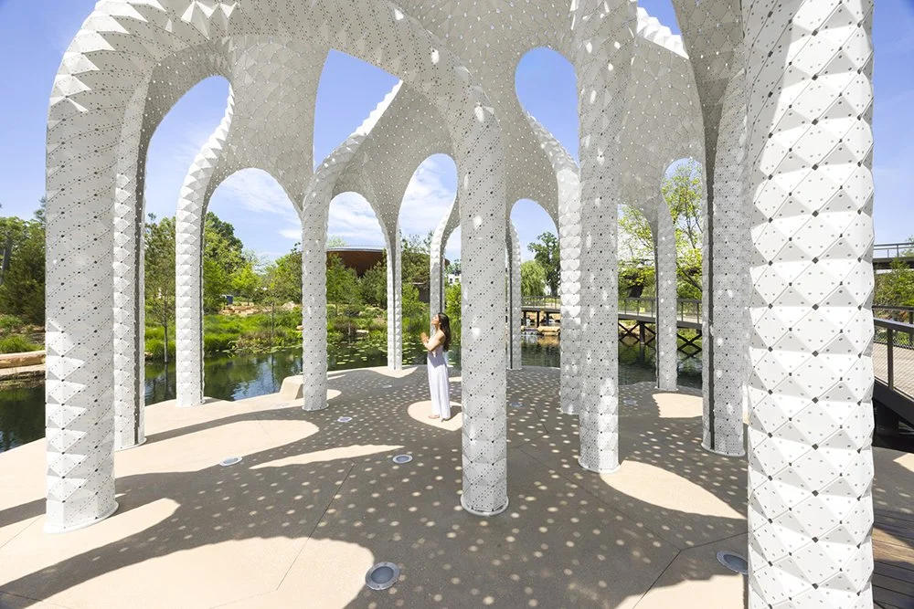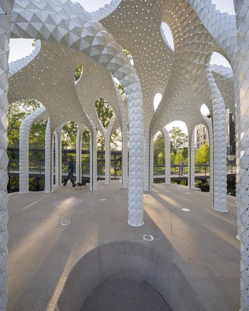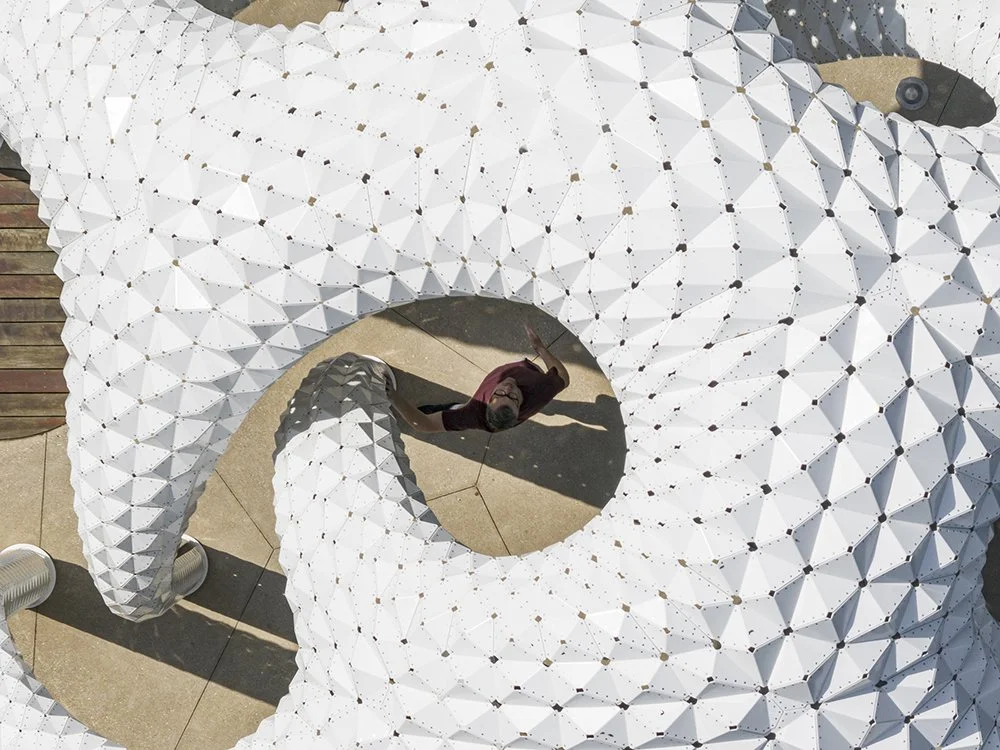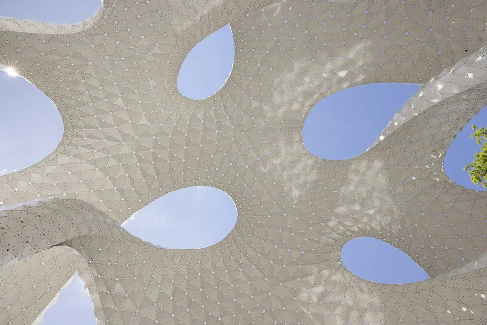 Constructed from ultra-thin folded aluminum panels, each piece is digitally fabricated and precisely riveted into place. There is no hidden frame: the skin is the structure. Thousands of perforations filter sunlight into delicate patterns, turning the canopy into an ever-changing atmosphere of shadow and shimmer.