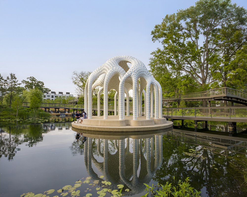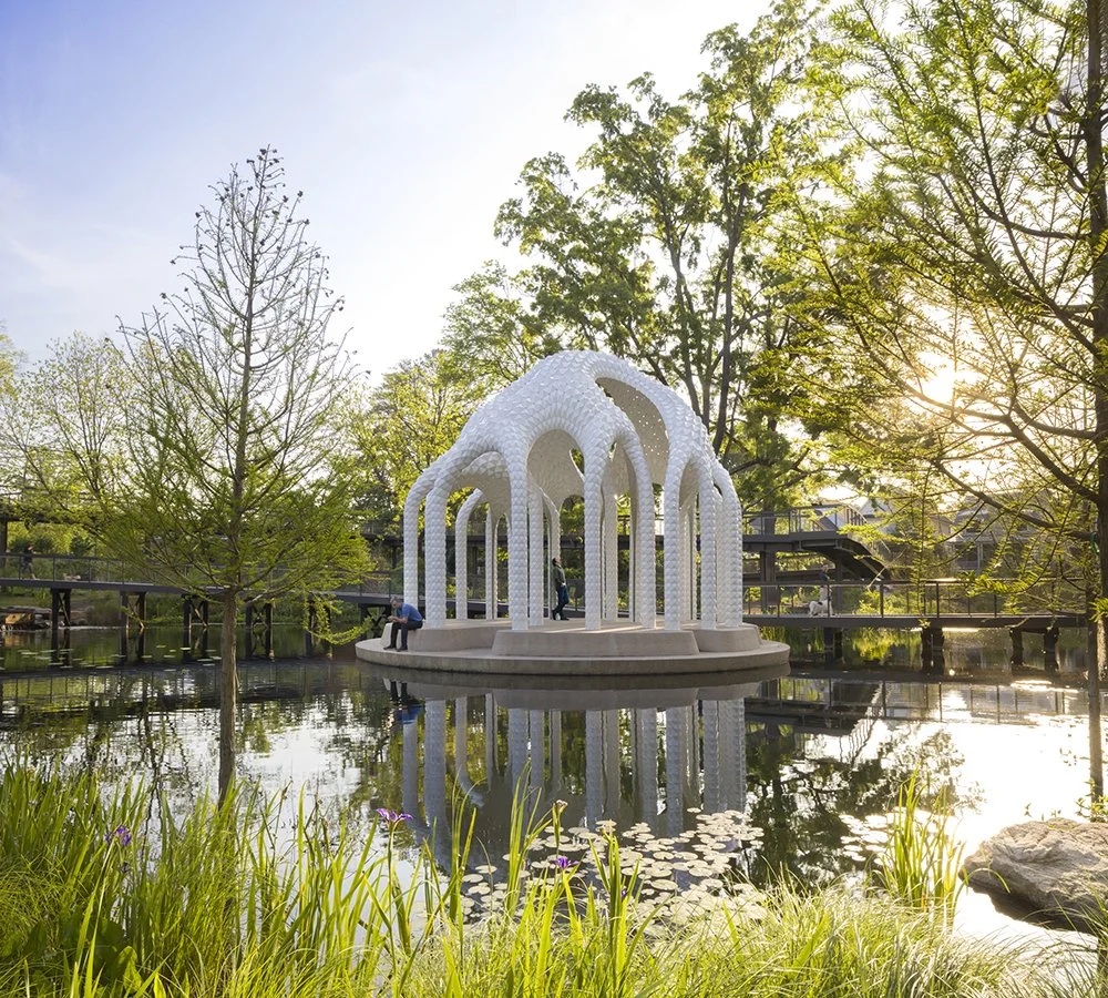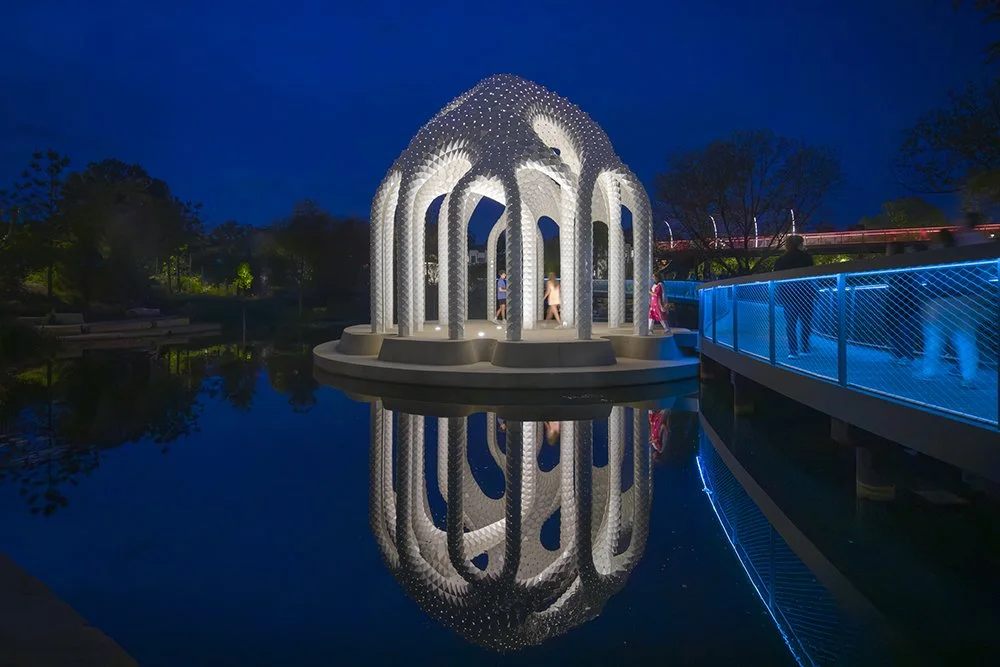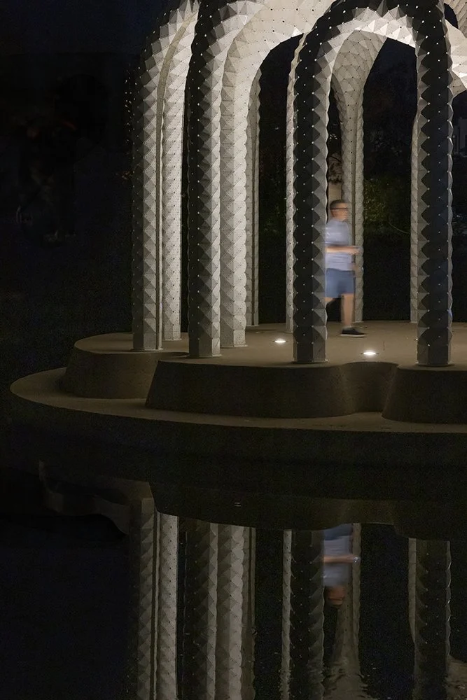 By day, the structure plays with reflections across the pond. By night, it becomes a glowing presence—an island lantern in the park. It is both spectacle and shelter, a place designed not only to be seen, but to be used: for weddings, small ceremonies, performances, or simply quiet pauses during a walk.