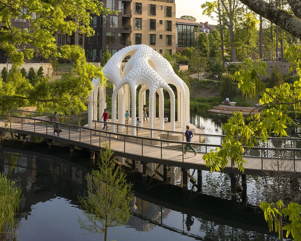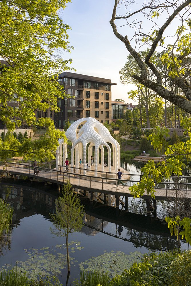 L’île Folie is also deeply connected to Cary itself—a fast-growing town shaped by new industries, younger communities, and an increasingly active public life. Downtown Cary Park was built from the ground up as a new civic landscape, filled with cafés, music, water, and gathering spaces. The folly becomes part of that ambition: a contemporary monument to the idea that parks are not just green spaces, but cultural stages.