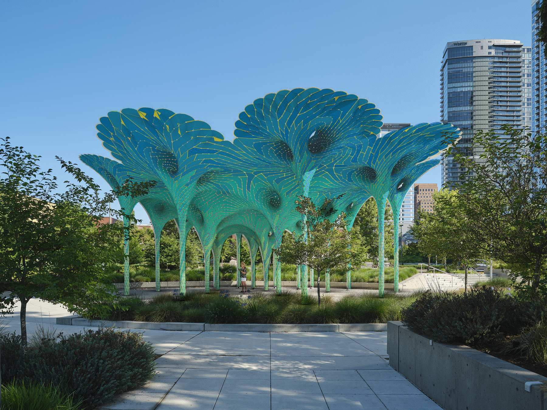 Commissioned by the City of Bellevue, PILOTI is a striking rotunda structure designed by Marc Fornes and THEVERYMANY, standing as an iconic entrance to Bellevue’s Downtown Park. This ultra-thin, self-supported installation is a harmonious fusion of elegance and structural innovation, utilizing a lightweight aluminum surface that gracefully unfolds into a complex, umbrella-like canopy.