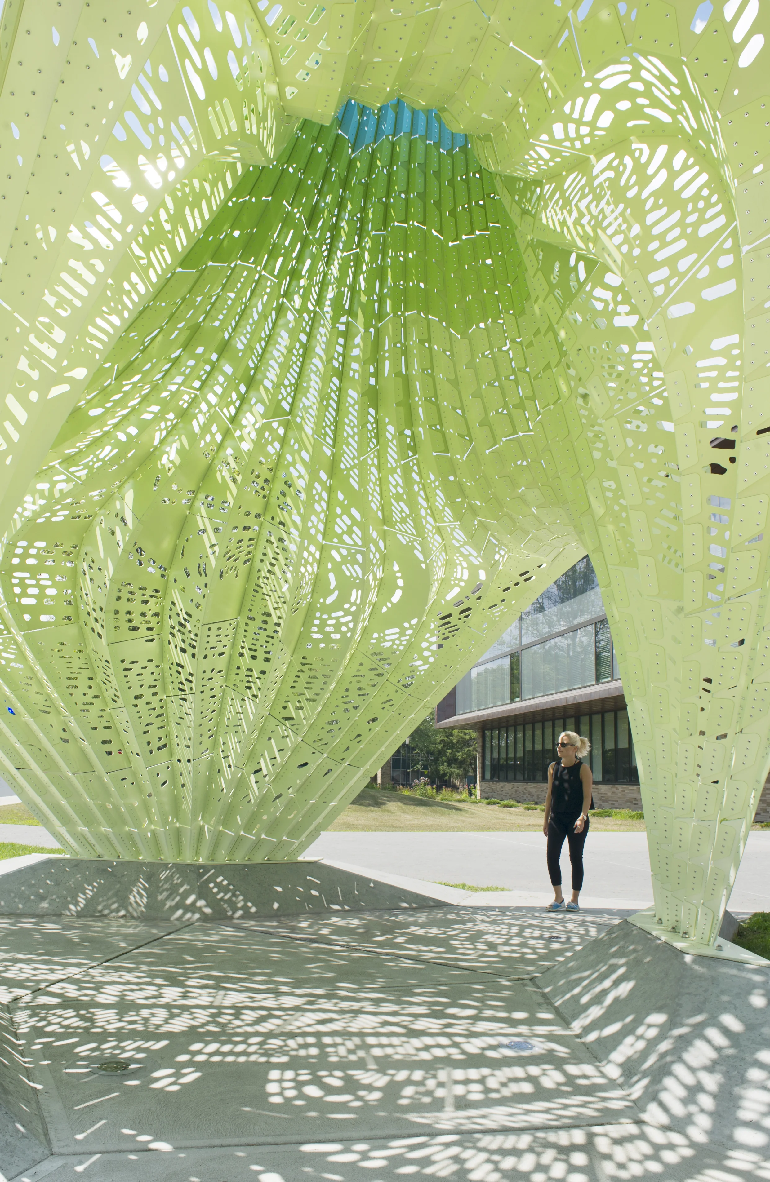 The College, a site of experimentation and discovery, makes an appropriate home for HYPARBOLE. This structure builds on several years of research and further develops the studio's efforts to unify structure, form and experience into coherent material systems. In a burst of green curves, HYPARBOLE stands delicately and confidently as a gateway to creative practice. At the entrance to the Fine Arts Center, the pavilion ushers studio-goers, faculty and campus visitors alike toward inspiration and action. Its oculus ascends to an imposing height of 22' at this focal point, making it a force majeure touching down on only three concrete bases.