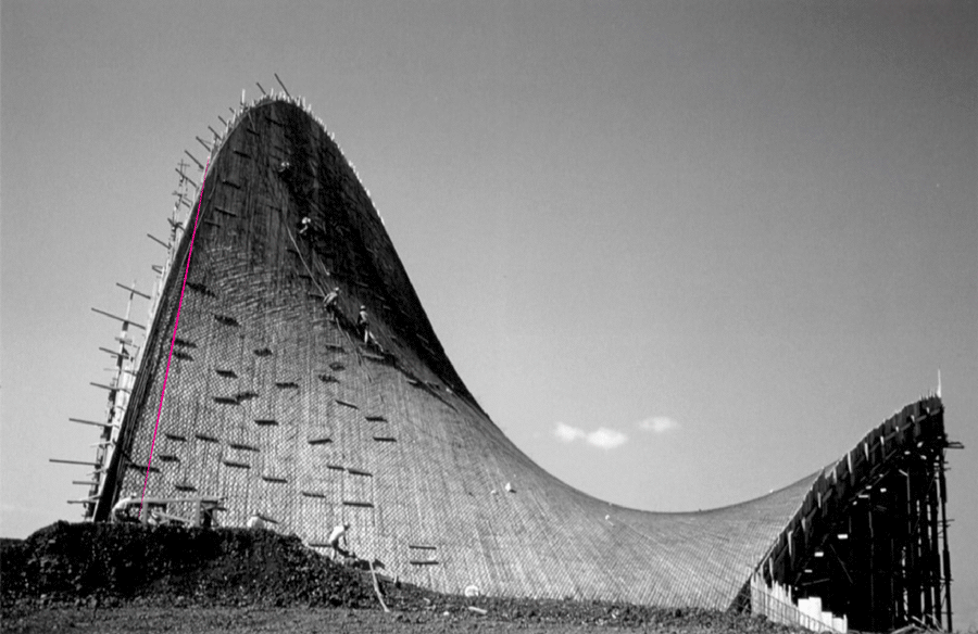 Felix Candela's use of the hypar geometry in his own design of structural concrete shells (up to 4cm thin) proved that the material economy in linear construction formwork had its advantages. While there are numerous projects implementing hyperbolic paraboloids as a premise for design, especially in the mid-20th century, straight members are usually used as formwork and reinforcing but are rarely left as a set of articulated lines across a continuous paraboloid surface.